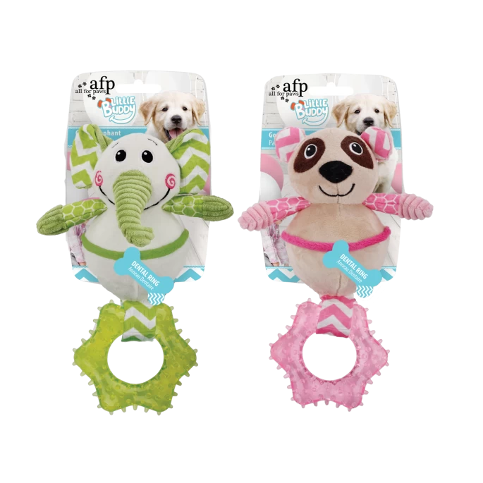 Het ultieme bijtring speeltje voor puppies! Verzorgt tanden en tandvlees en heeft een piepende bal als extra toevoeging.