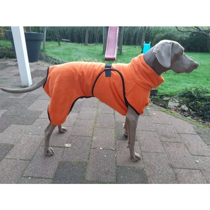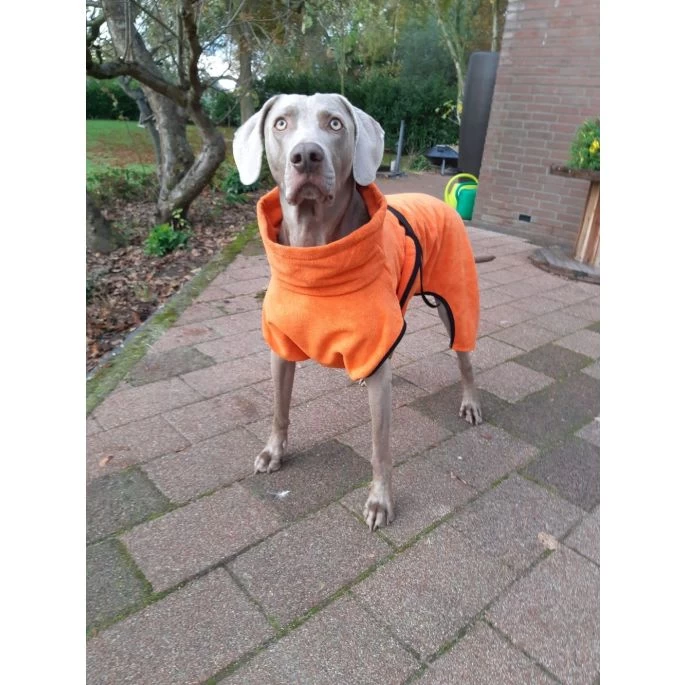 De maat wordt bepaald op basis van de ruglengte van uw hond. Deze bepaalt u door de afstand van de nek tot de staartaanzet te meten. Natuurlijk kunt u ook langskomen met uw hond langs om de badjas te passen.