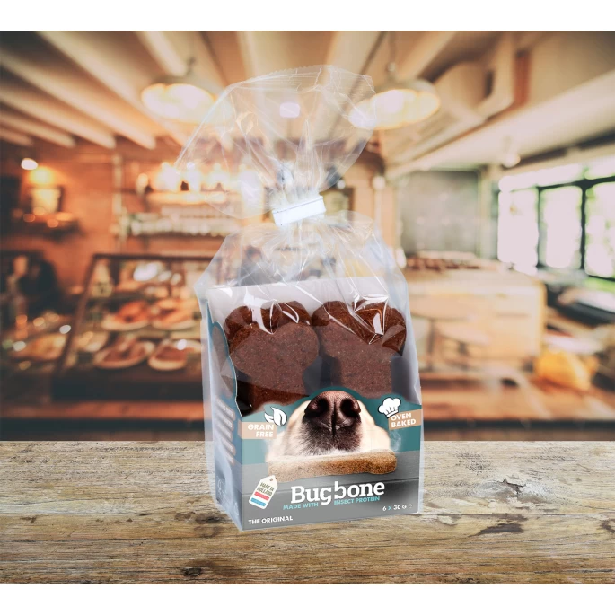 Deze snack voor honden is ambachtelijk in de oven gebakken. Bereid met insecteneiwit en andere ingrediënten die 100% geschikt zijn voor menselijke consumptie.