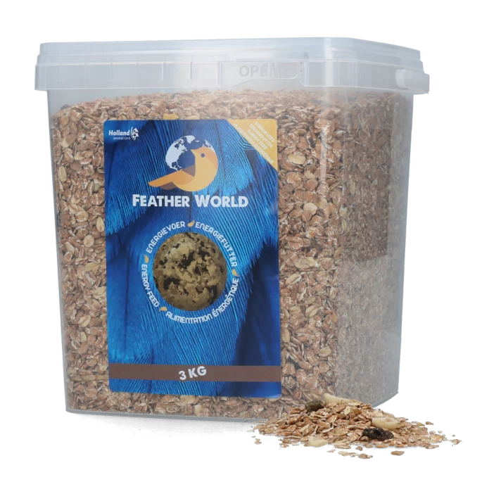 Het Feather World Energievoer voor vogels bestaat uit een samenstelling van haver- en tarwevlokken, rozijnen, mariadistelolie en pinda’s. Het voer biedt energie aan wilde vogels en kan gebruikt worden als aanvullend diervoeder. Feather World Energievoer voor vogels is bij te voederen naar behoefte en wordt geleverd in een hersluitbare emmer.