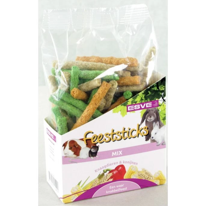 ESVE feest sticks zijn natuurlijke en bijzonder gezonde sticks Voor hobby konijnen en knaagdieren. Feest sticks bevatten belangrijke voedingsstoffen en zijn een aanvulling op de dagelijkse voeding. De feest sticks zijn niet alleen gezond, maar bevredigen ook de natuurlijke knabbelbehoefte en bevordert door zijn speciale samenstelling de spijsvertering en is licht verteerbaar. Het is een genot de dieren te zien knabbelen.
