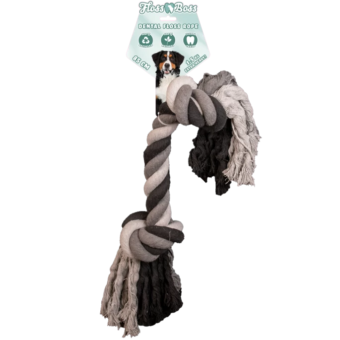 Dit geweldige flostouw is gemaakt van 100% katoen. Het is veilig, natuurlijk en duurzaam en uitermate geschikt voor apporteer- of trekspelletjes. Tijdens het spelen helpt het flostouw het gebit van je hond te reinigen. Daarnaast is dit flostouw van Floss Boss strakker gevlochten en veel sterker dan reguliere flostouwen. Dit komt omdat er alleen hele draden gebruikt zijn.