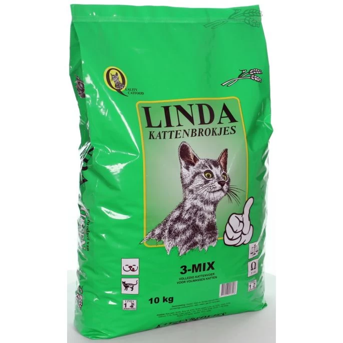 LINDA KATTENBROKJES 3-MIX is een volledig kattenvoer voor volwassen katten. Voedingsadvies: Zorg dat er altijd voldoende vers drinkwater klaar staat!Een gemiddeld grote kat heeft per dag ongeveer 75 gr droogvoer nodig,een drachtige kat max. 130gr en een zogende kat max. 400gr.Samenstelling: granen, vlees, dierlijke bijproducten, oliën, vetten, plantaardige bijproducten, bijproducten van de suikerbereiding, gist en mineralen. kip. vis.