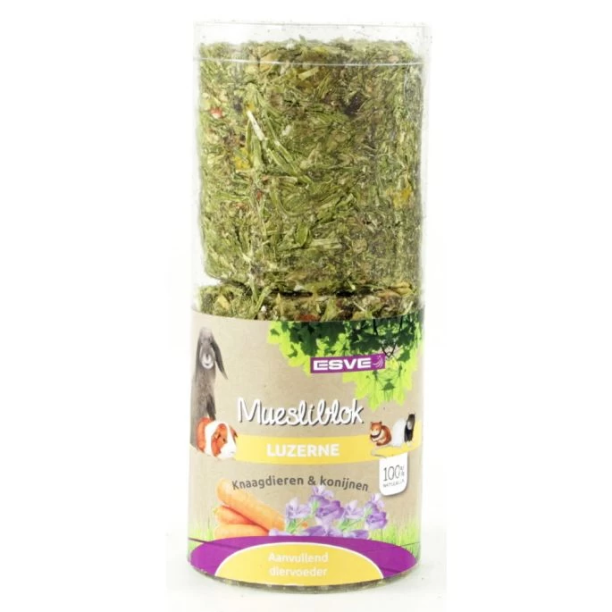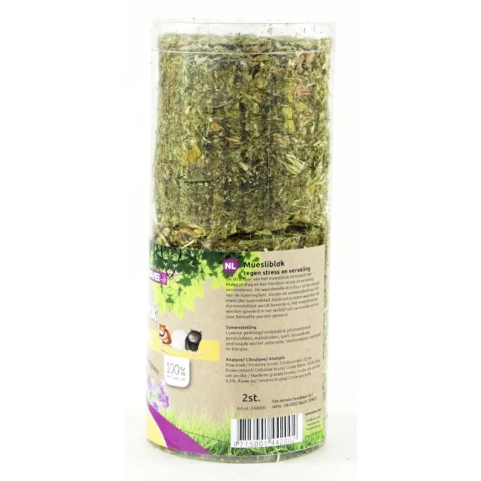 De structuur van het muesliblok stimuleert het knaaggedrag en kan hierdoor stress en verveling verminderen. De waardevolle structuur uit de stengel van de luzerneplant, zonder de aanwezigheid van het eiwitrijke luzerneblad, biedt extra vezels waardoor de darmmobiliteit wordt bevorderd. Het muesliblok kan worden gevoerd in het verblijf van uw huisdier en kan naar behoefte worden gevoerd.