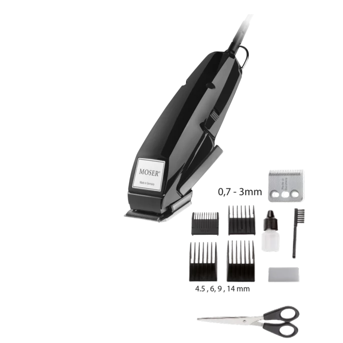 Ter uitbreiding van het Moser-assortiment; de Moser 1400! Een populaire tondeuse voor het volledig scheren van kleine honden of katten met een niet al te zware/dikke vacht. De tondeuse is licht in gewicht en ligt prettig in de hand. Het scheerapparaatje is zeer robuust te noemen, dankzij de duurzame oscillerende aandrijving en bewezen technologie. Daarnaast beschikt de tondeuse over een handige geïntegreerde snijlengteverstelling met 6 standen, die variëren van 0,7 tot 3 mm. De mesjes zijn afklikbaar en makkelijk te wisselen én te reinigen.