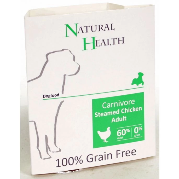 Kip 60%. aardappel. wortel. erwten. mineralen. zonnebloemolie. zalmolie. gedroogde tomaat. gedroogd zeewier. gedroogde basilicum.
